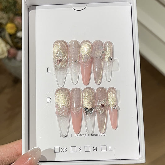 Handmade nails,sweet style nails,pink,long square,cream , silk ribbon and butterfly on the nails,reusable,for everyone