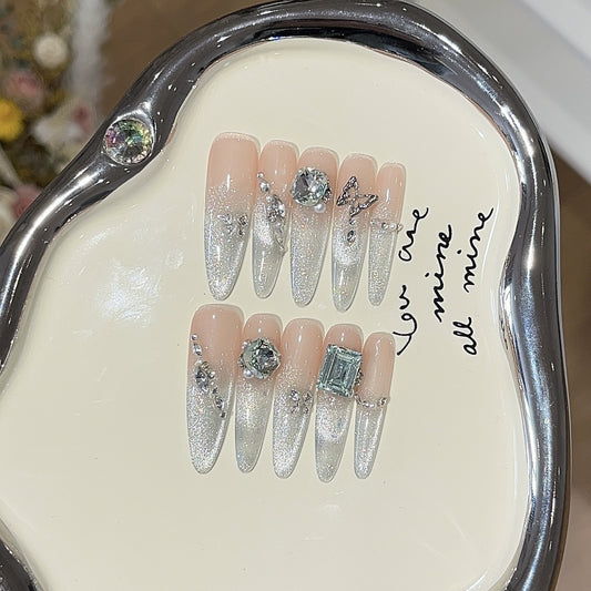Handmand nails,light luxury high-end style,silver light bulb,extra long coffin,cat eye armor,diamond,reusable,for everyone