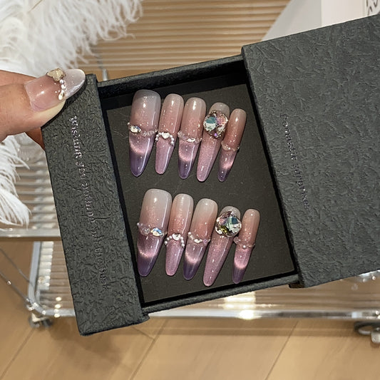 Handmade nails,Ombre nails,French style,purple,long square,diamond,cat eye armor,reusable,for everyone