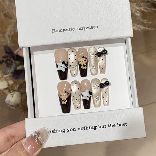 Handmade nails,sweet style nails,pink and black,cat eye armor,polka dot,bow and cat on nails,long coffin, aily banquets are acceptable,for everyone