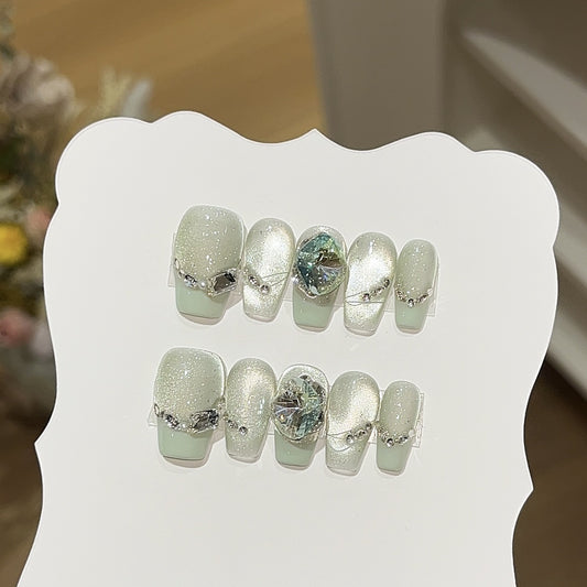 Handmade nails,classy nails,mint green,summer,short oval,cat eye armor,diamond,reusable,for everyone